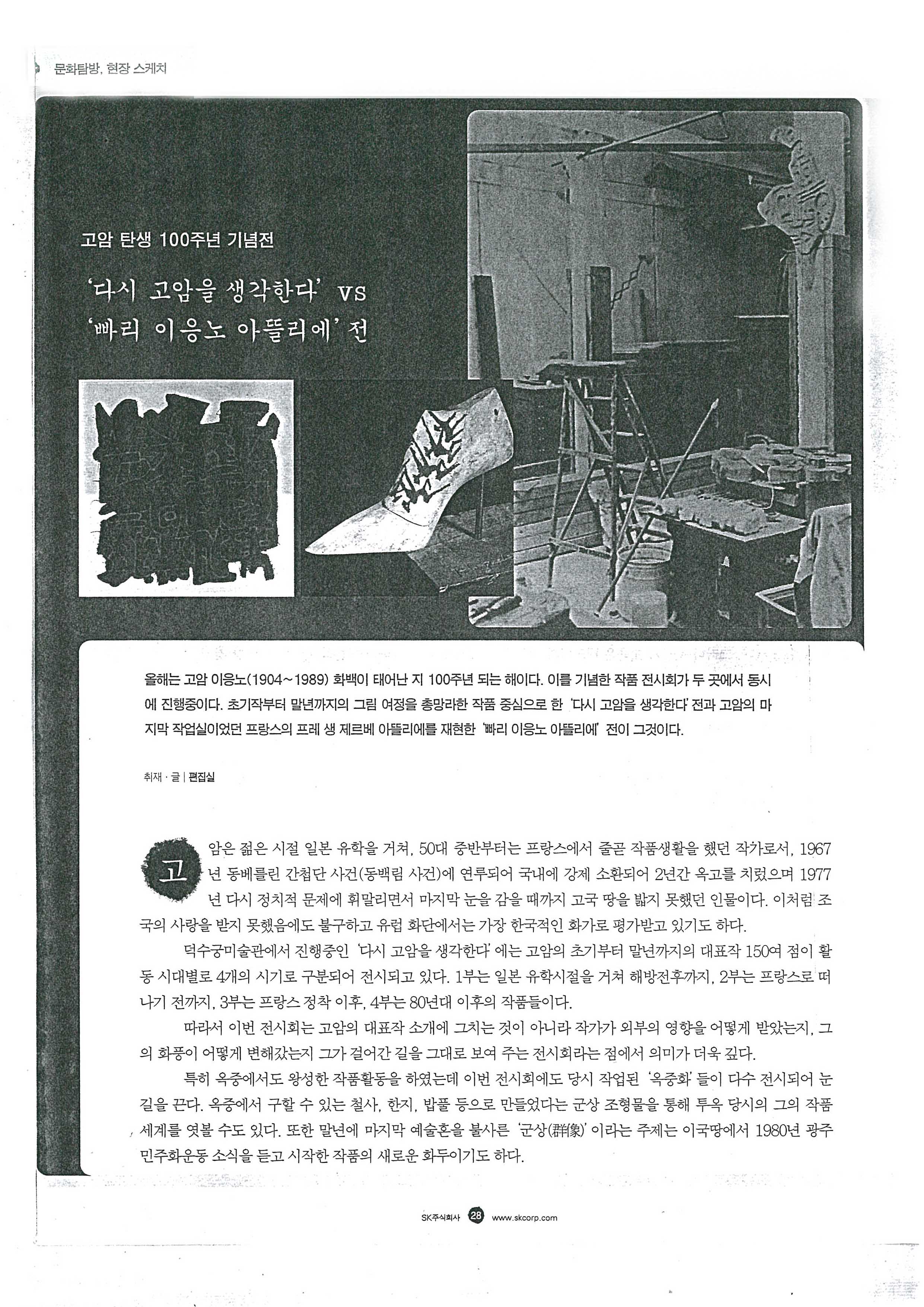 「고암 탄생 100주년 기념전: '다시 고암을 생각한다' vs '빠리 이응노 아뜰리에전'」, 『사보SK』 (「Goam 100th Anniversary Exhibition: 'Rethinking Goam' vs 'Paris Atelier de Ungno Lee'」, 『SK Company Newsletter』)
