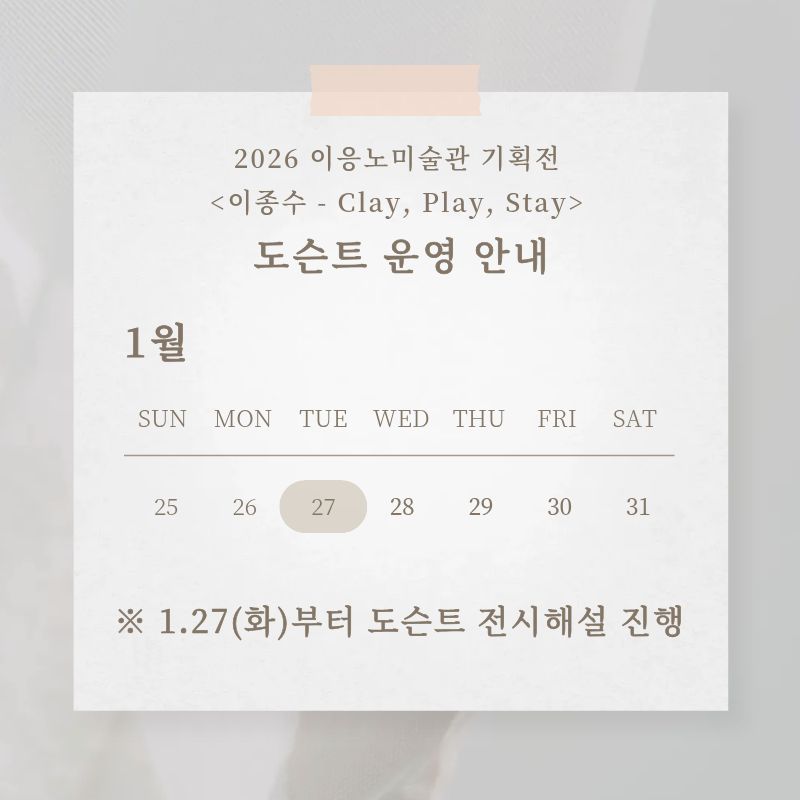 | 제목 | 2026 이응노미술관 도슨트 운영 안내 <이종수-Clay, Play, Stay> | ||